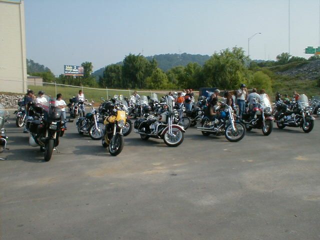 Inside, ET HOG members relax and cheer another successful Second Harvest benefit ride.