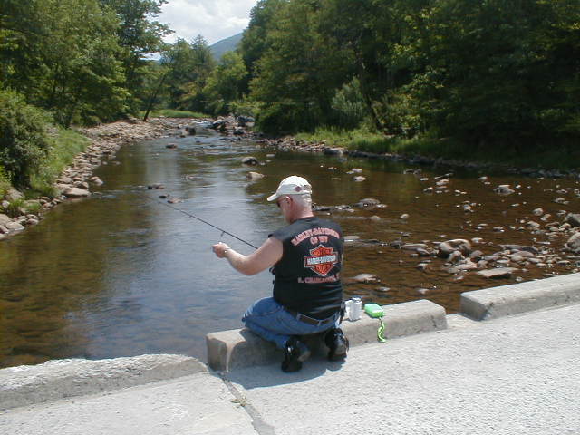 This little covered bridge crosses a stream filled with 'lunker' trout! Mary is hitting the fish food machine!